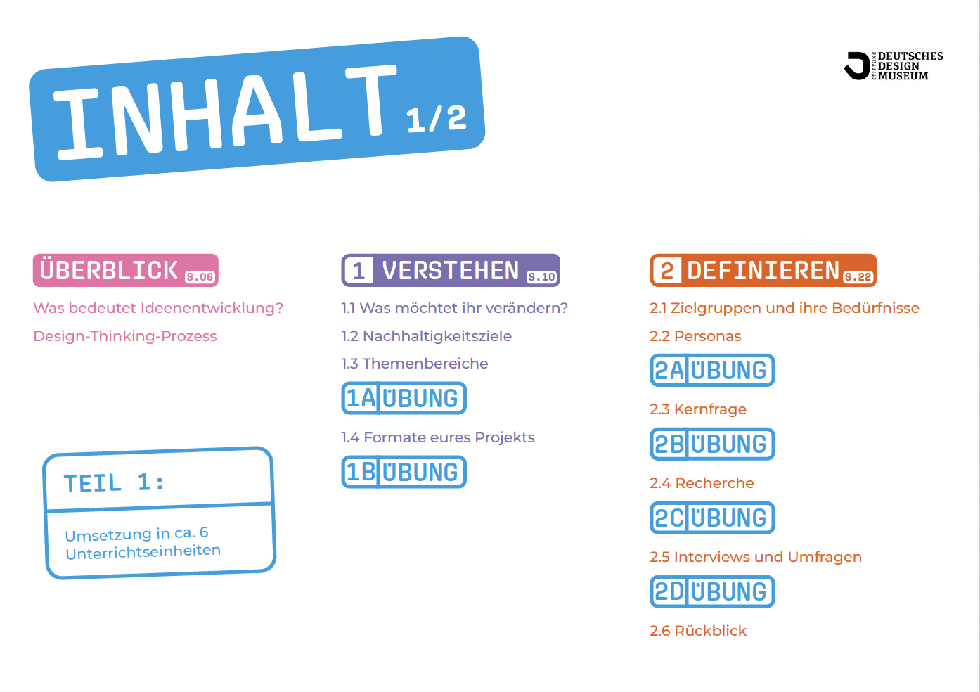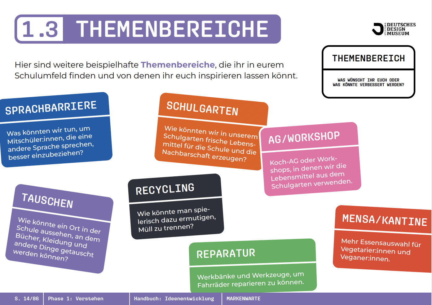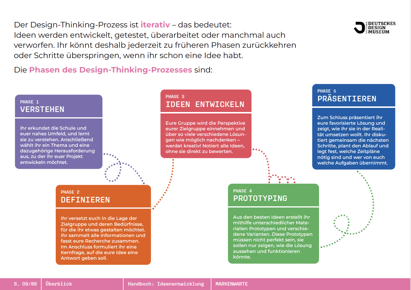 Dieses Handbuch unterstützt Schülerfirmen, AGs und andere Schulgruppen dabei, kreative und sinnvolle Projekte für ihre Schulgemeinschaft oder ihr Umfeld zu entwickeln. Durch praxisnahe Übungen werden die Teilnehmenden schrittweise durch den Design-Thinking-Prozess geführt – eine strukturierte und schülergerechte Methode zur Ideenfindung und Problemlösung.