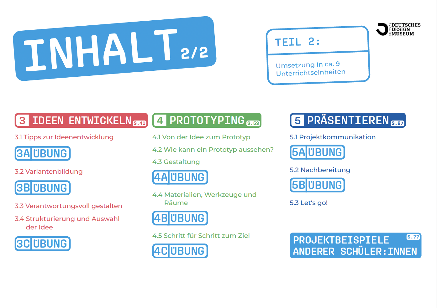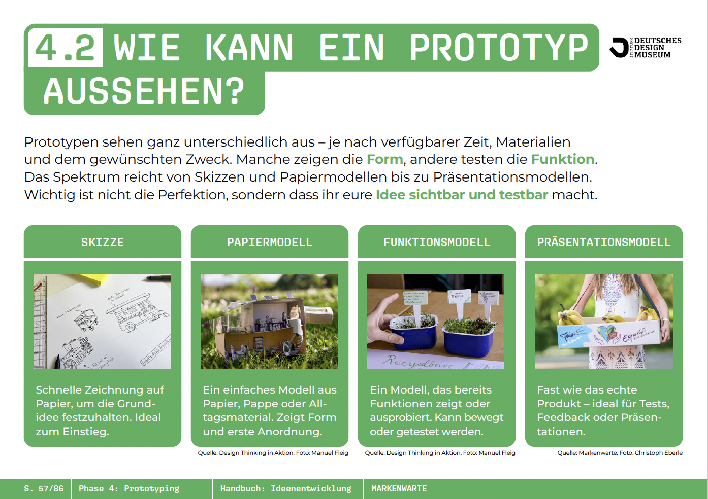 Am Ende des Handbuchs sind die Teilnehmenden in der Lage, einen Prototyp zu präsentieren und ihre Idee in die Praxis umzusetzen. Im besten Fall entsteht daraus eine neue Schülerfirma an der Schule.